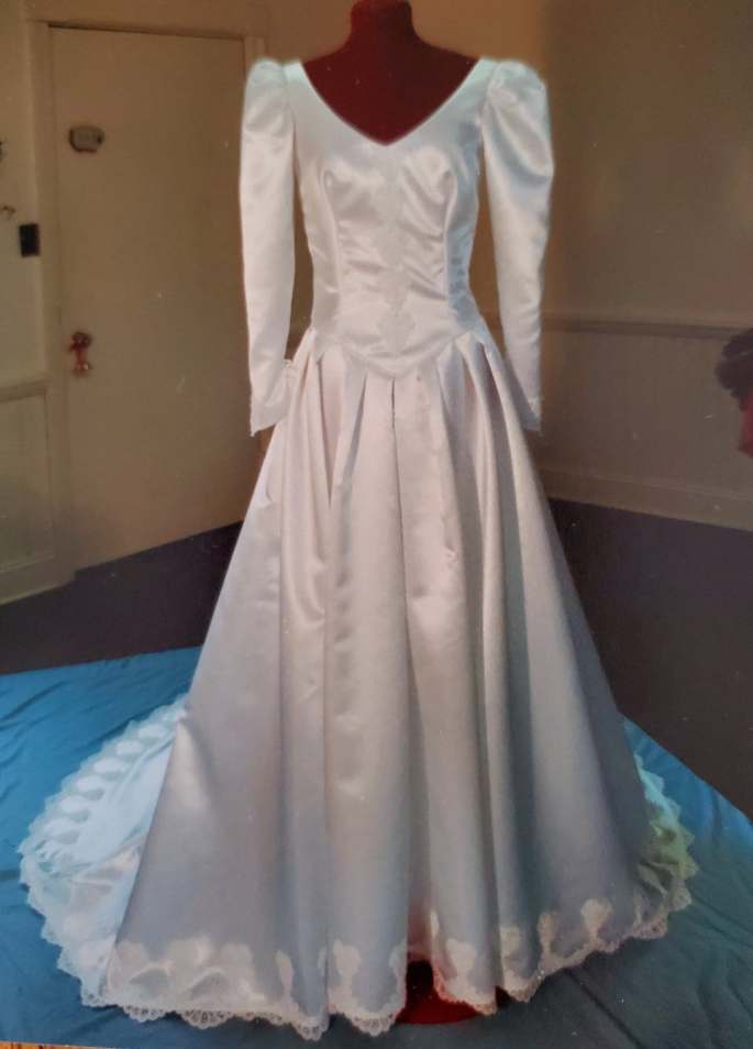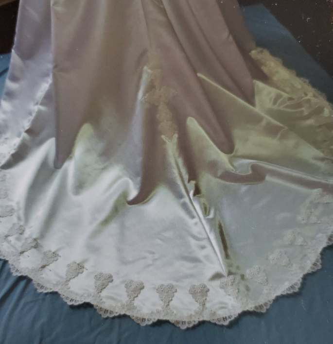 Mother, daughter, and I drove three hours to a fabric shop in a converted school to purchase the beautiful bridal satin, tulle, nylon net and lace trim. Over a period of 3 months, I constructed the gown.  Each lace medallion was hand-stitched in place and embellished with tiny pearls.  The veil was also embellished with randomly applied pearls. Bias satin covered piping along the drop-waist seam.